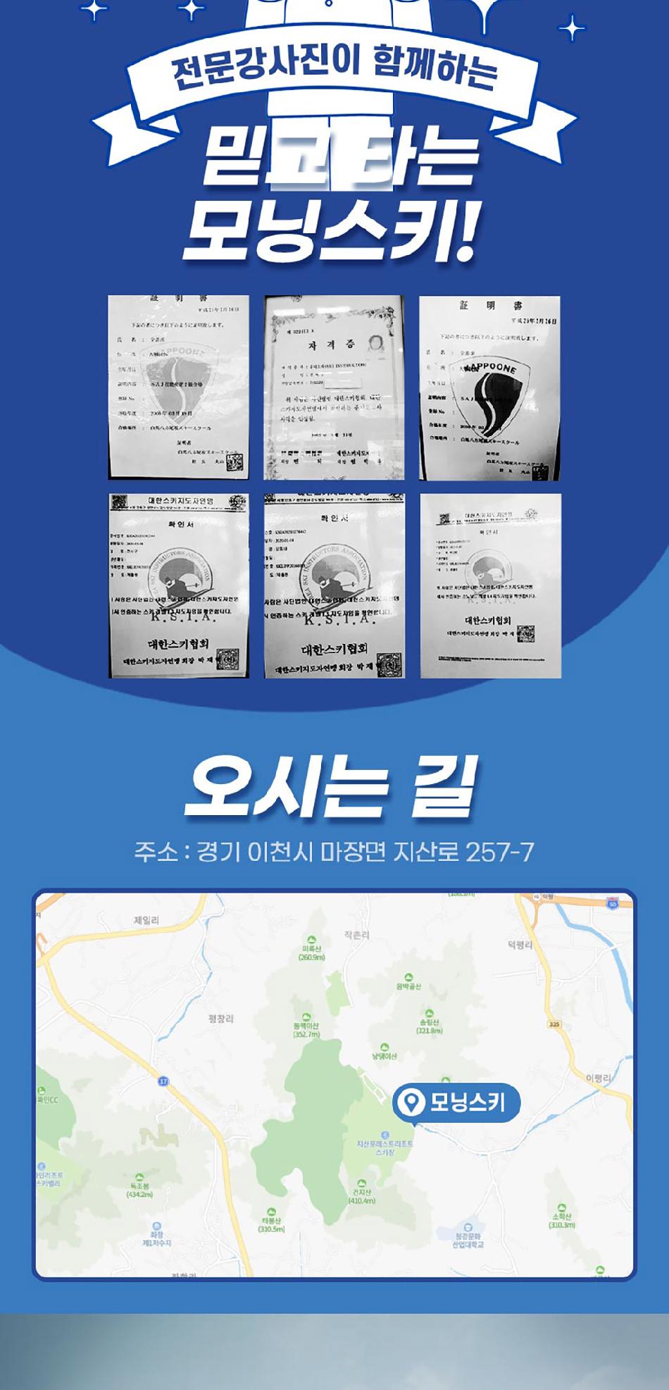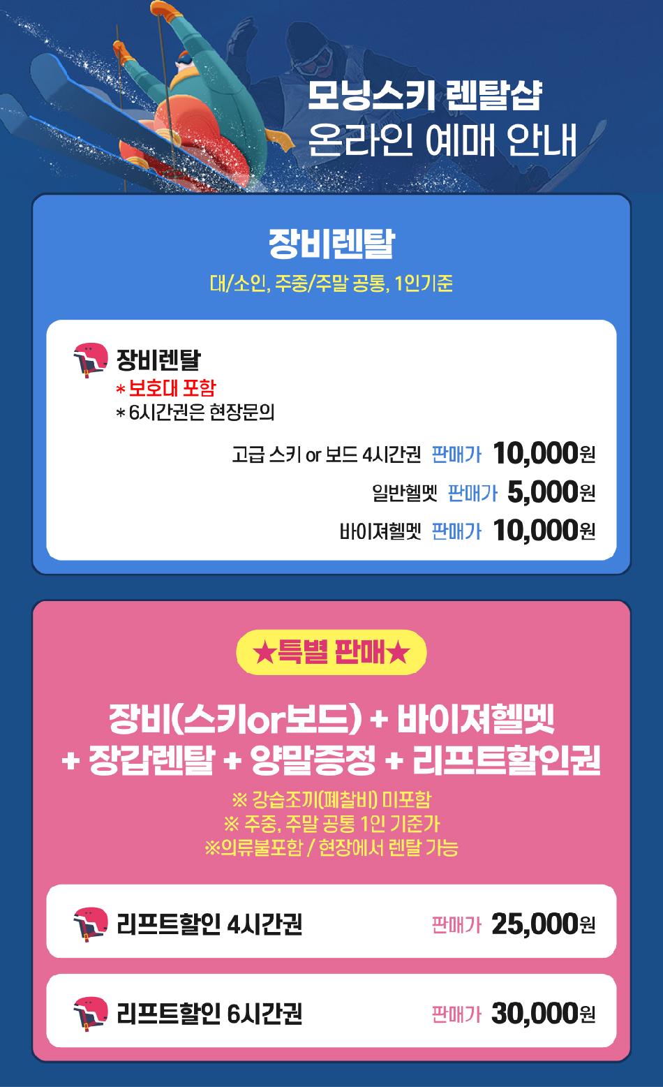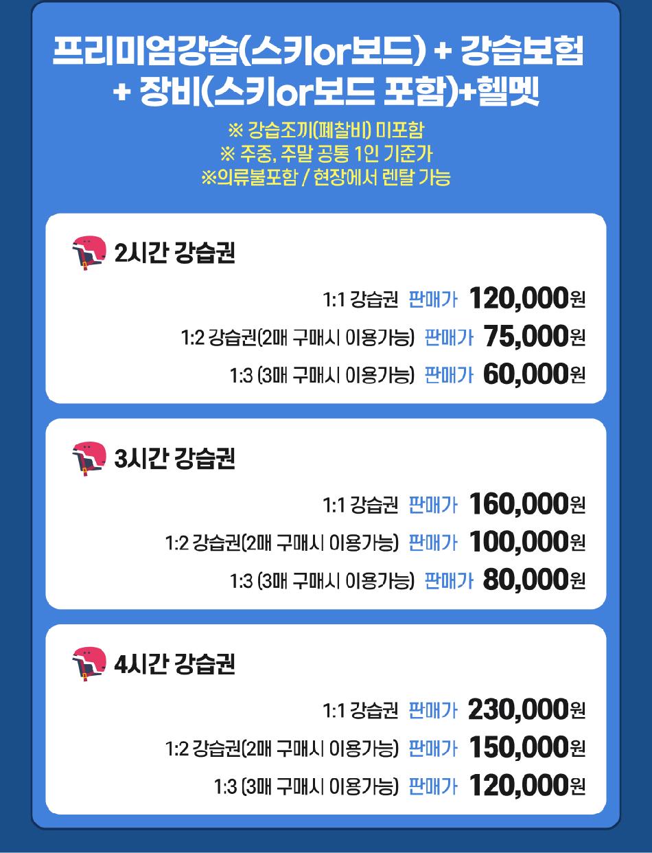 * 1) 강습상품: 현장에서 강습조끼 별도 구매 필수 (2시간권: 3만원, 3시간권: 4만원, 4시간권: 5만원)