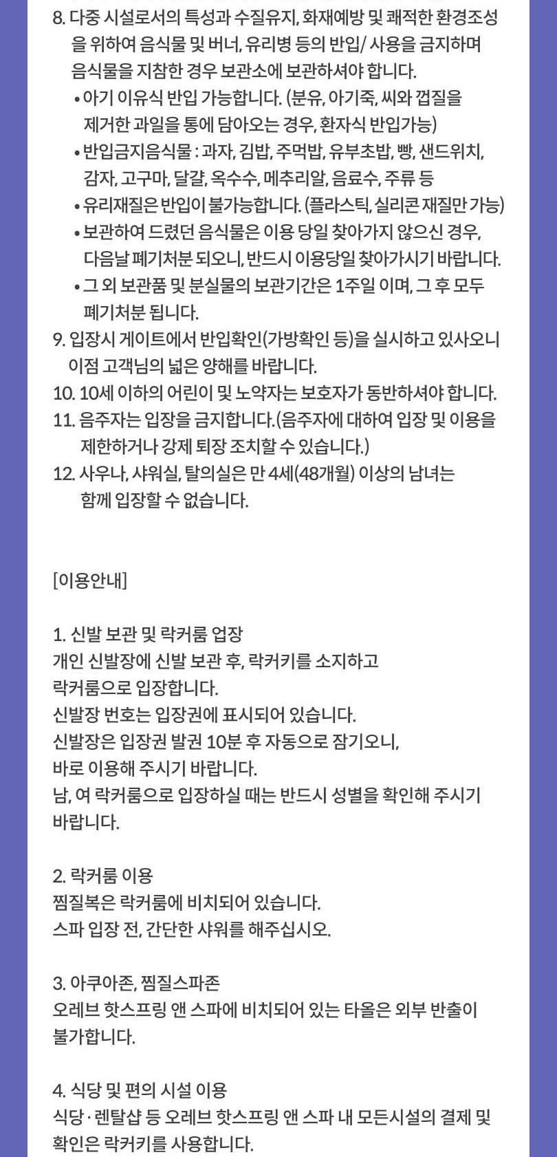 *6. 다중 시설로서의 특성과 수질유지, 화재예방 및 쾌적한 환경조성을 위하여 음식물 및 버너, 유리병 등의 반입/ 사용을 금지하며?음식물을 지참한 경우 보관소에 보관하셔야 합니다.?