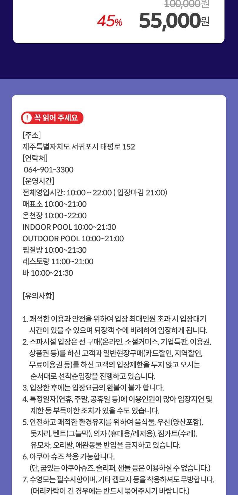 *2. 스파시설 입장은 선 구매(온라인, 소셜커머스, 기업특판, 이용권, 상품권 등)를 하신 고객과 일반현장구매(카드할인, 지역할인, 무료이용권 등)를 하신 고객의 입장제한을 두지 않고 오시는 순서대로 선착순입장을 진행하고 있습니다.