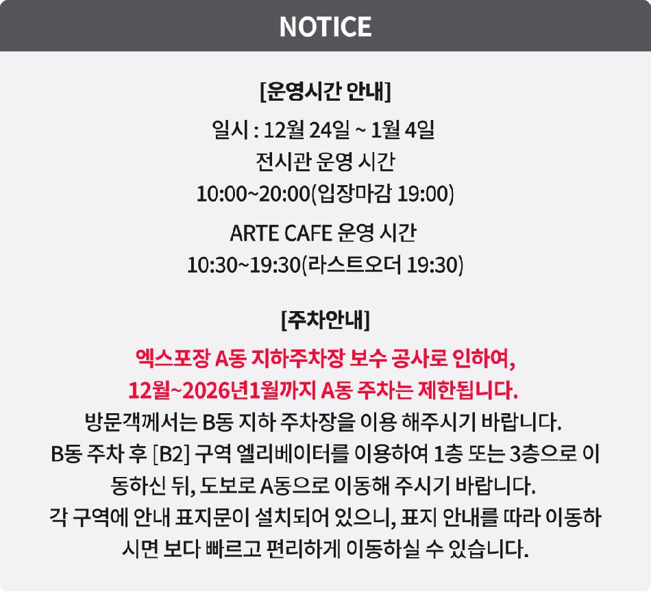 * 입장을 원하실 경우, ARTE CAFE 현장에서 체험 티켓 추가 결제 후 입장 가능합니다.(1인/1잔, TAKE OUT 불가)