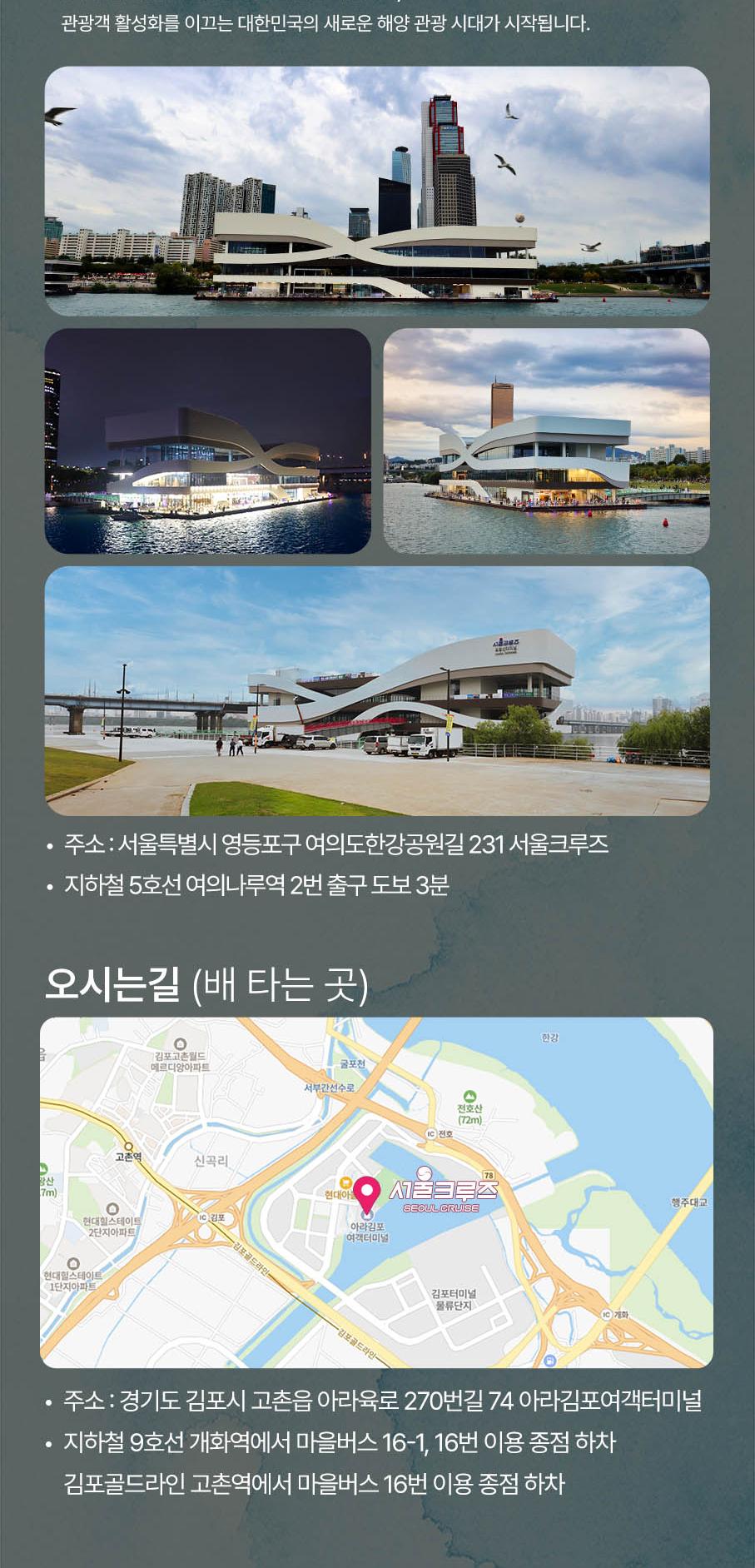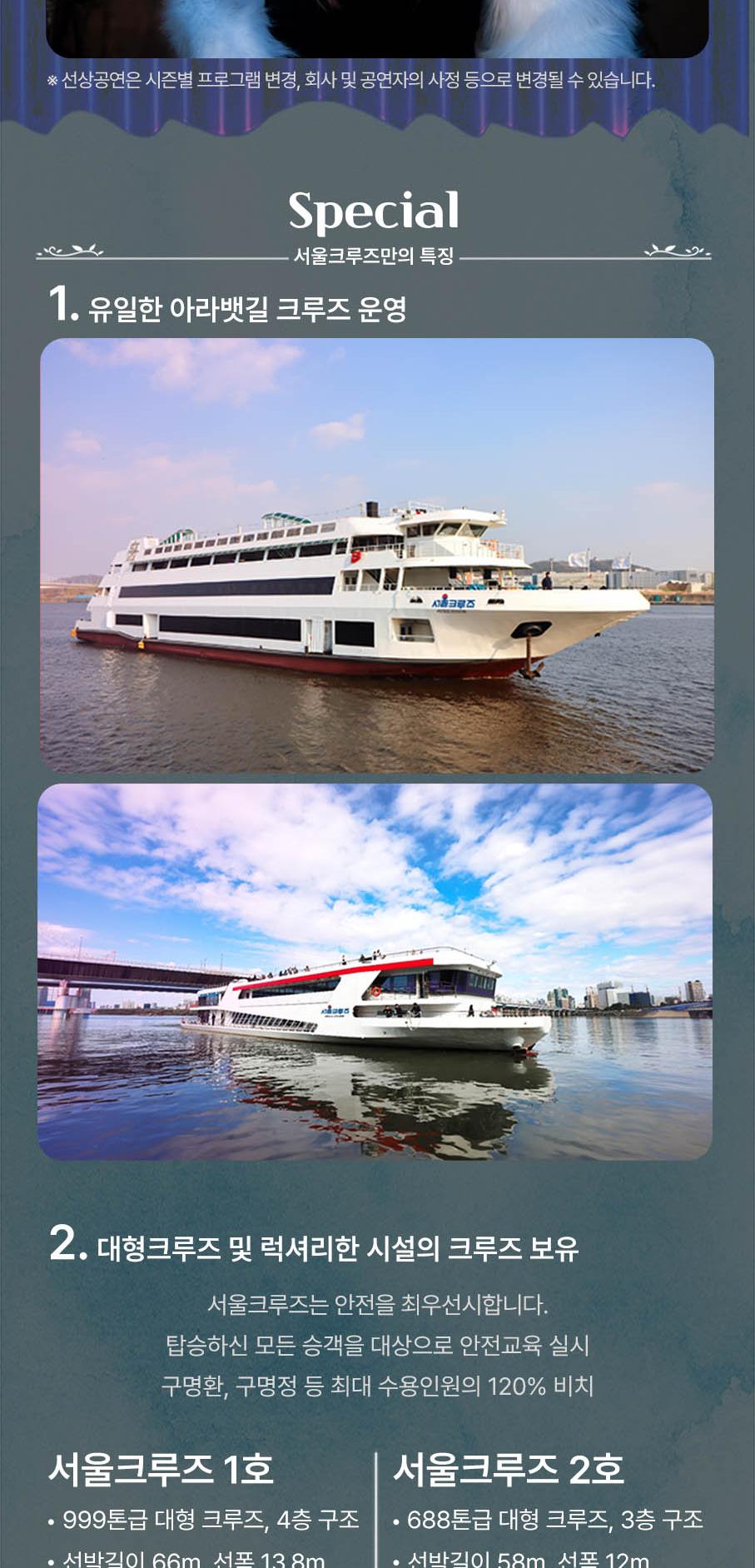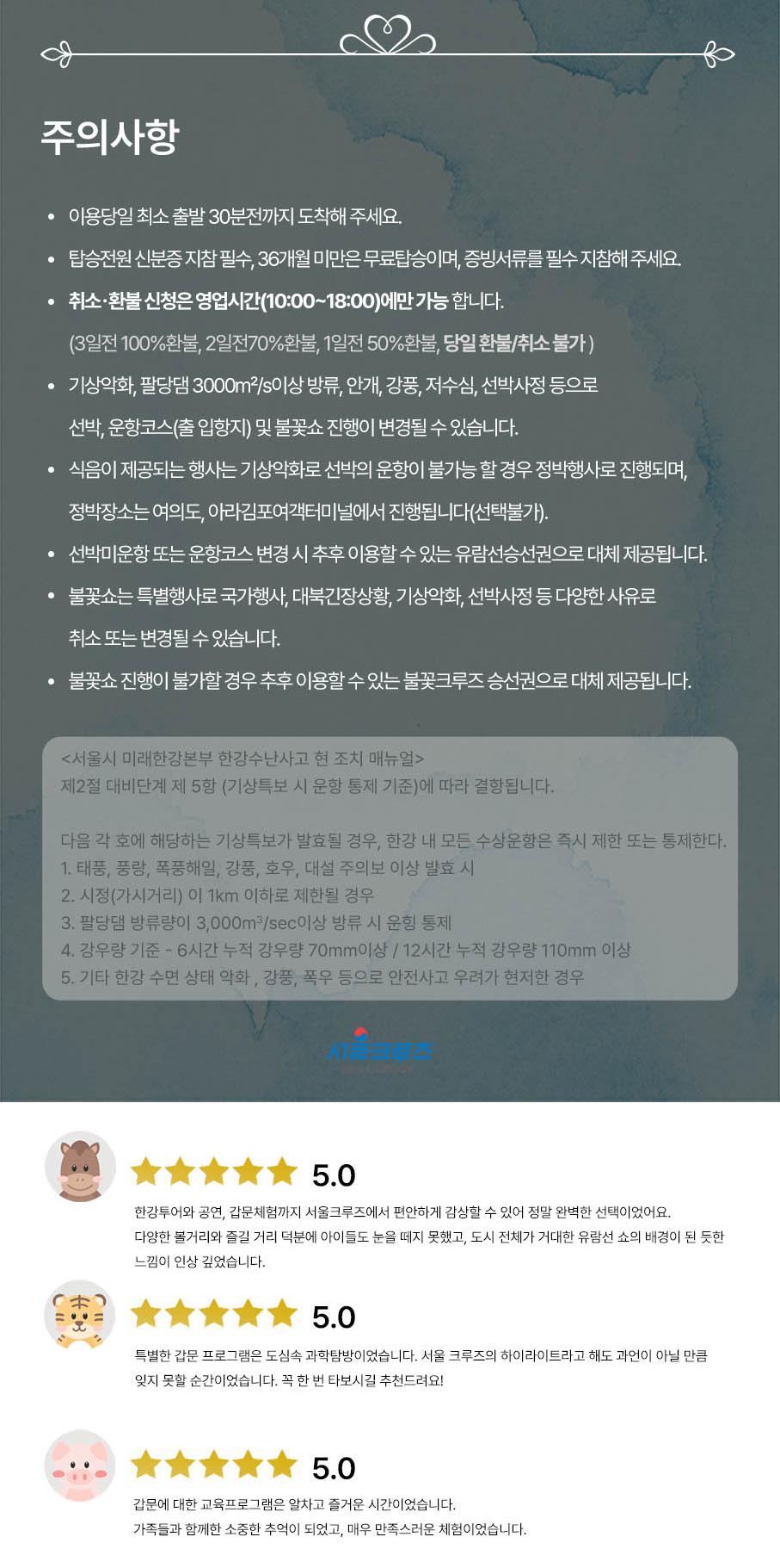 * 한강방류, 기상악화, 선박사정 등으로 한강 운항이 불가능할 경우 아라뱃길 코스로 진행되며, 이로 인한 환불 및 요금 인하는 없습니다.
