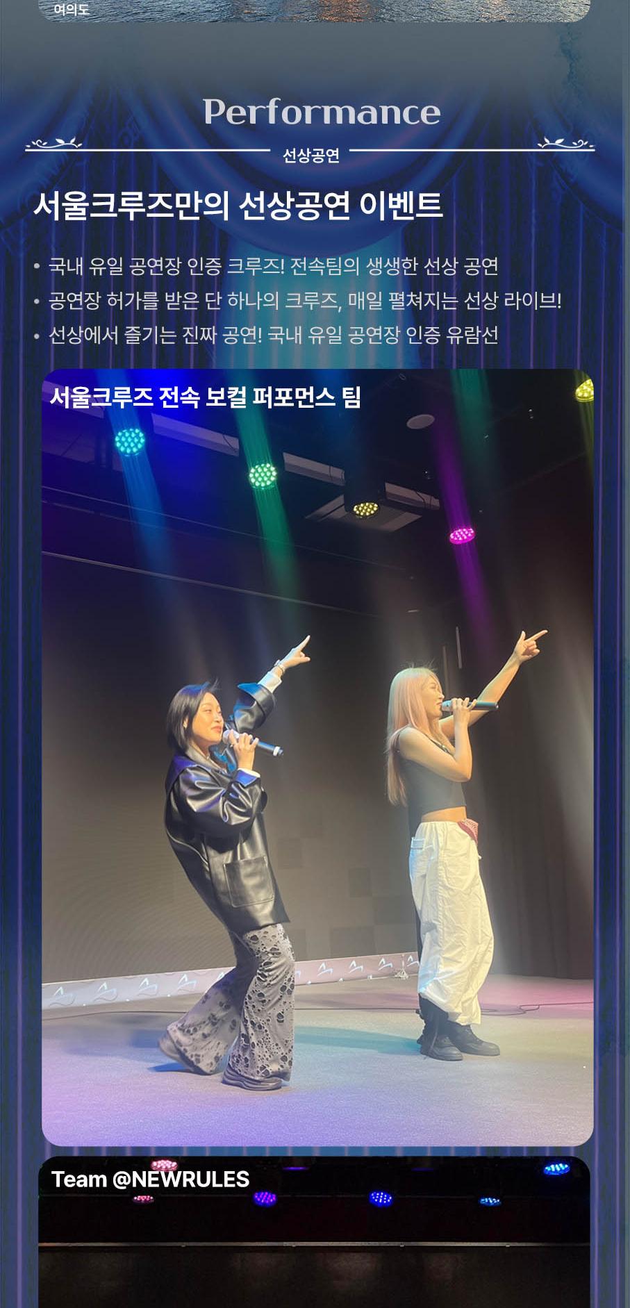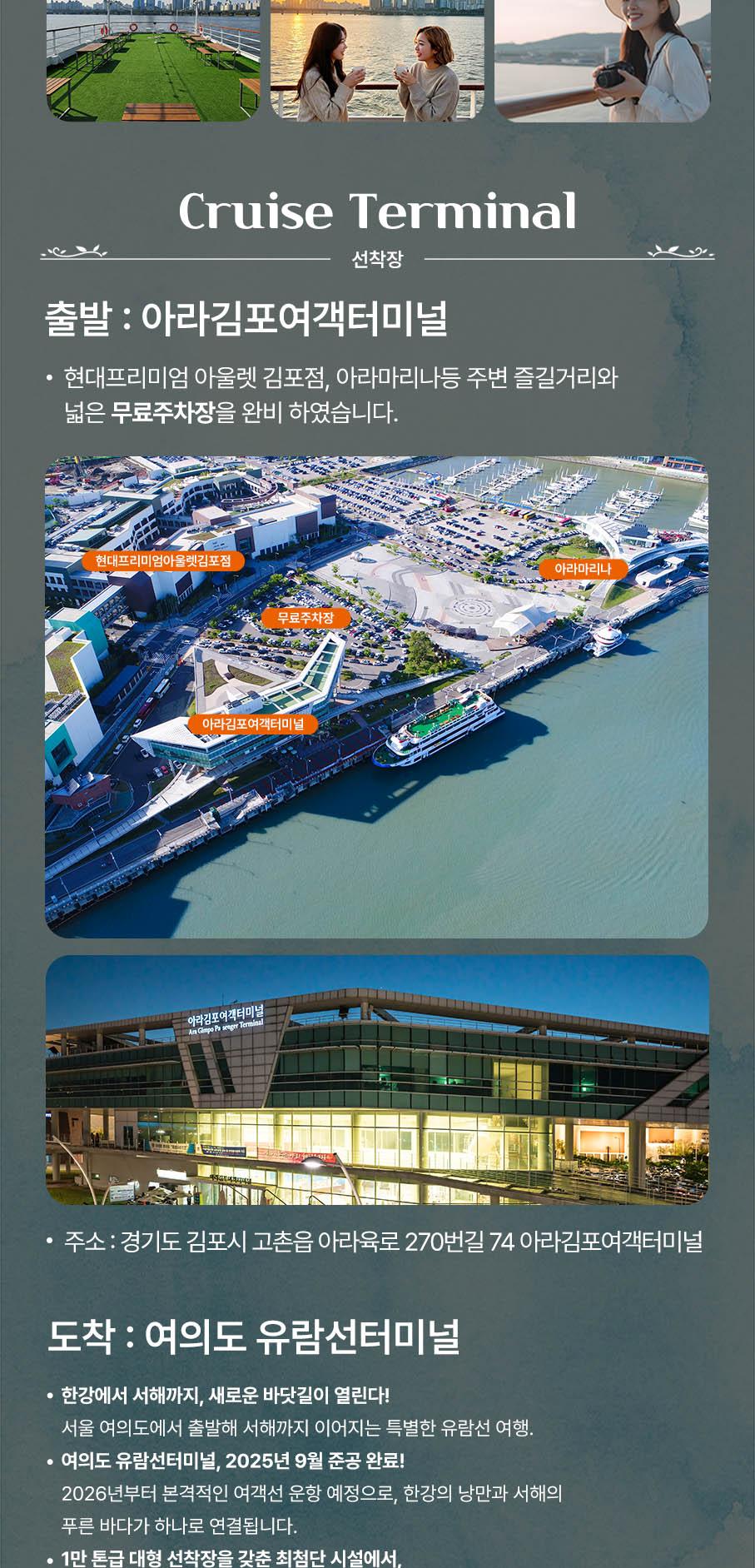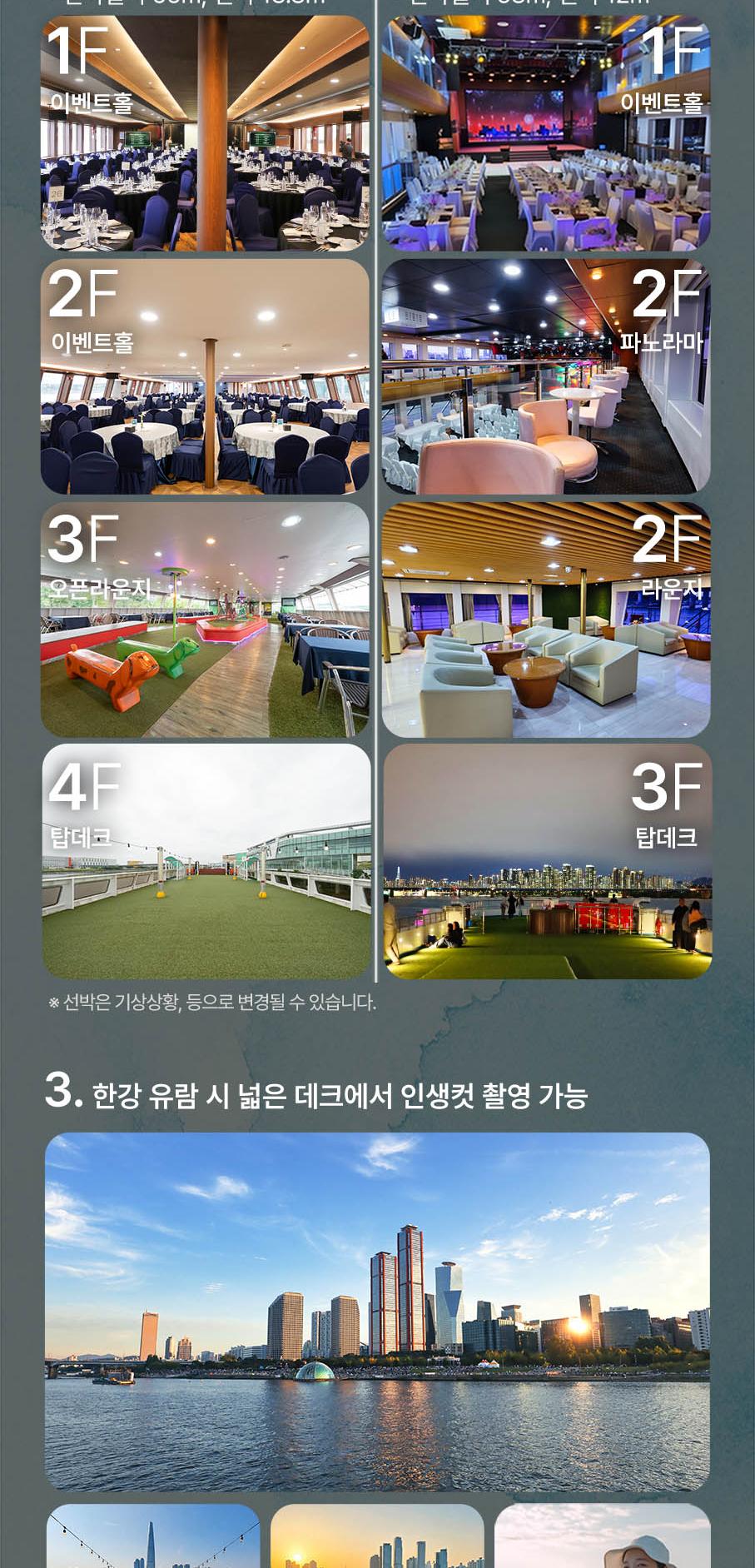 * 한강방류, 기상악화, 선박사정 등으로 한강 운항이 불가능할 경우 아라뱃길 코스로 진행되며, 이로 인한 환불 및 요금 인하는 없습니다.