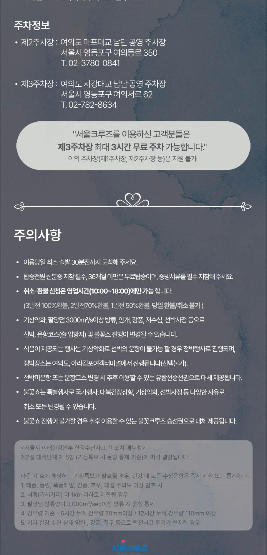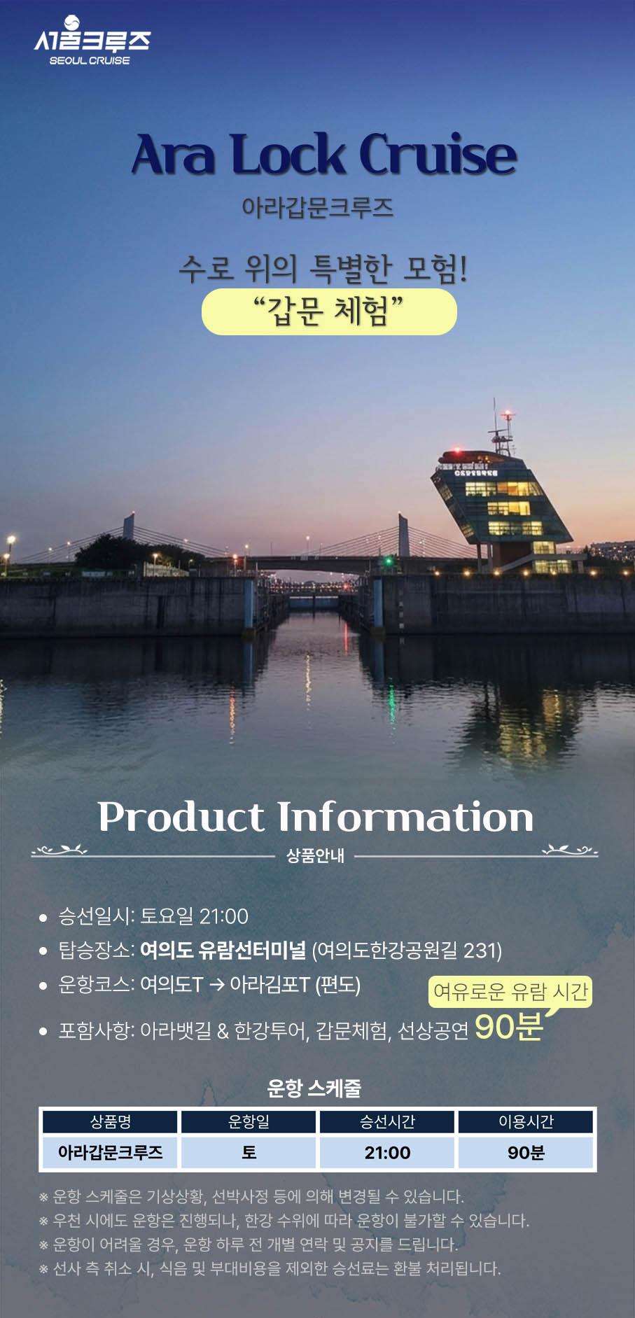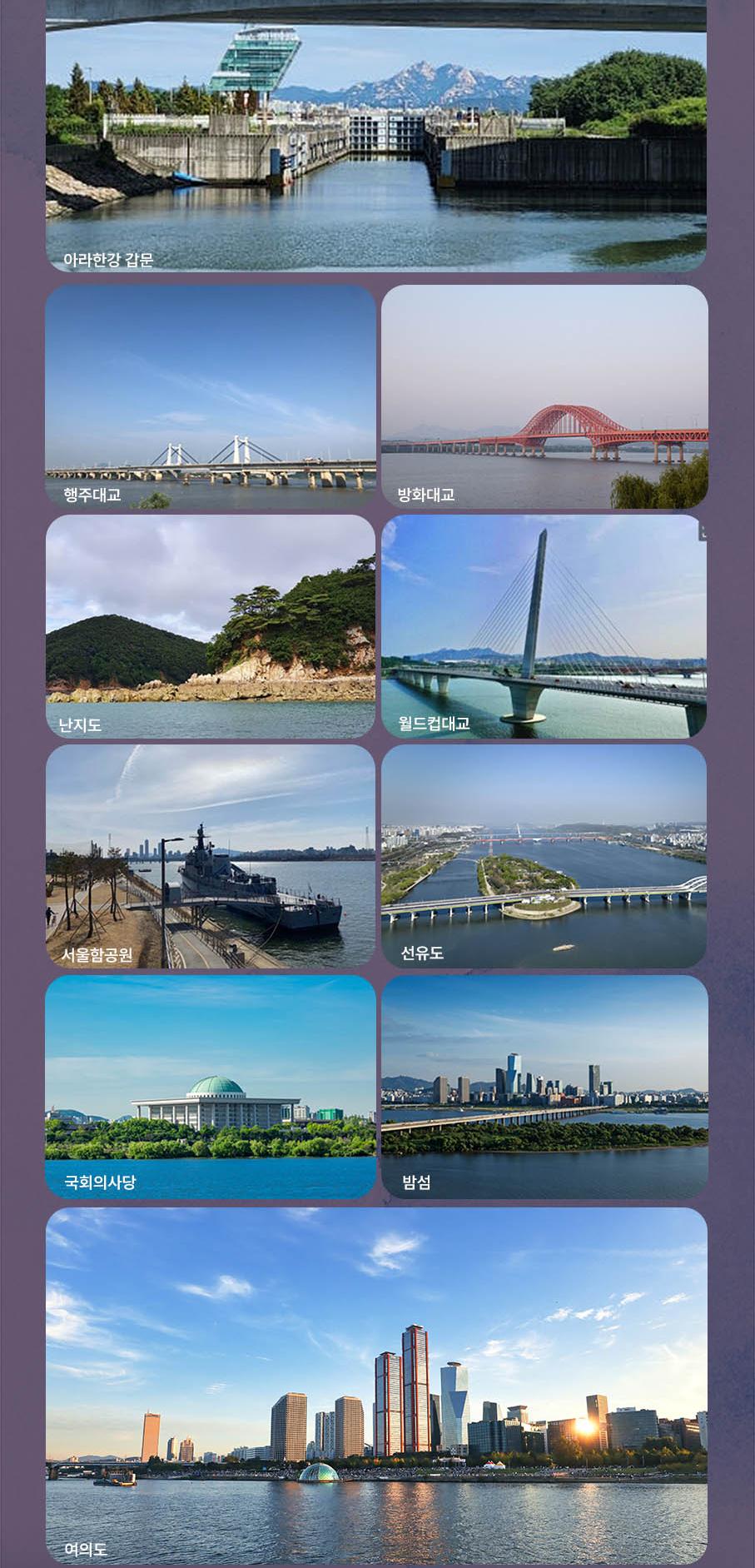 * 한강방류, 기상악화, 선박사정 등으로 한강 운항이 불가능할 경우 아라뱃길 코스로 진행되며, 이로 인한 환불 및 요금 인하는 없습니다.