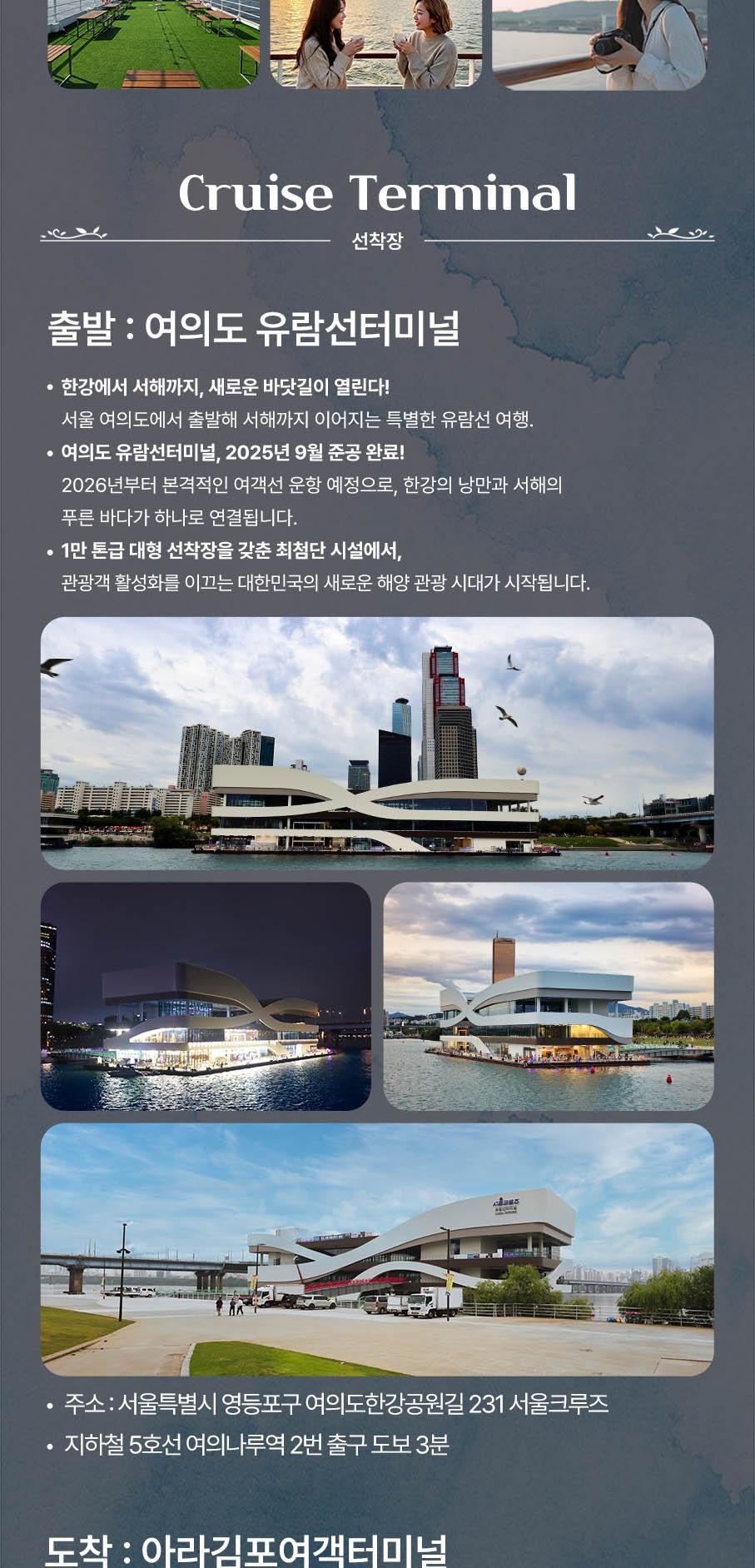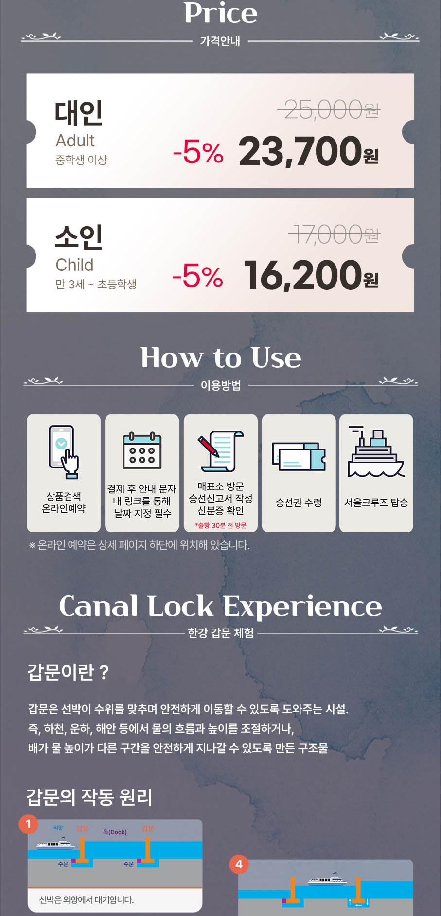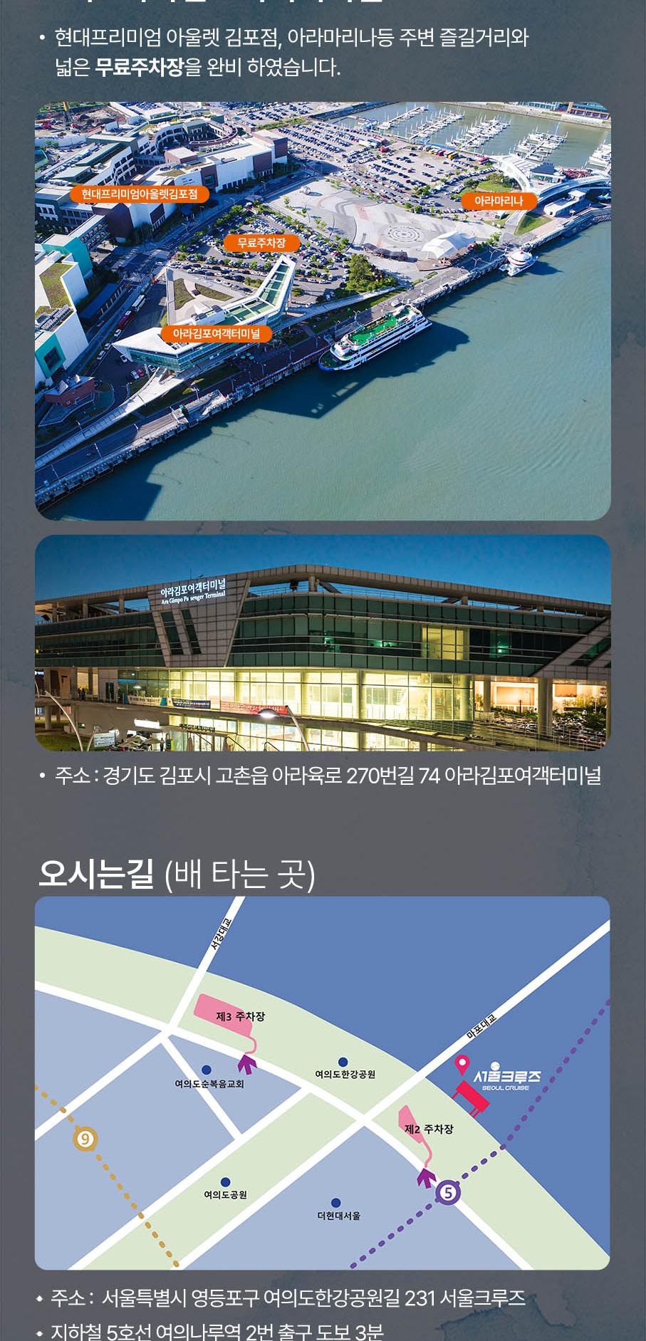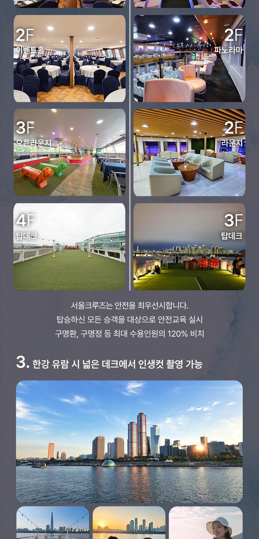 * 한강방류, 기상악화, 선박사정 등으로 한강 운항이 불가능할 경우 아라뱃길 코스로 진행되며, 이로 인한 환불 및 요금 인하는 없습니다.